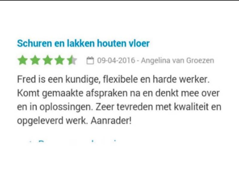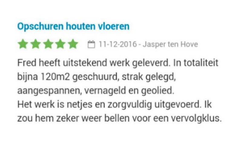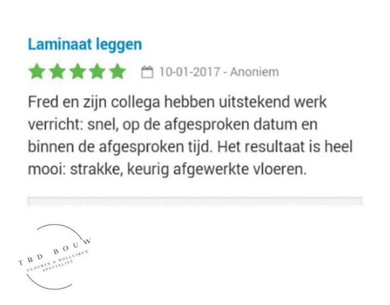 “Ik ben ontzettend tevreden over het werk van TRD Bouw. De vloer in mijn woning is prachtig gelegd en de service was uitstekend. Ik zou ze zeker aanbevelen aan anderen!”